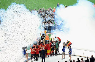 11. La selección española da la vuelta al campo mostrando la Copa a los aficionados.